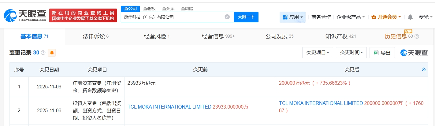 天眼查工商信息显示,近日,茂佳科技(广东)有限公司发生工商变更,注册资本由约2.4亿港元增至20亿港元,增幅约736%。