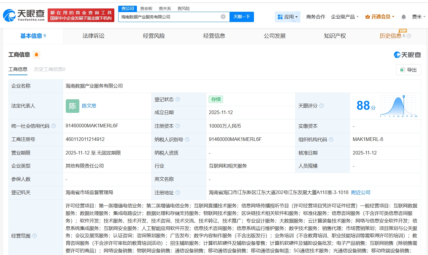天眼查工商信息显示,近日,海南数据产业服务有限公司成立,法定代表人为陈文思,注册资本1亿人民币,经营范围包括第一类增值电信业务、第二类增值电信业务、互联网直播技术服务、信息网络传播视听节目等。股东信息显示,该公司由中国电信(601728)旗下天翼资本控股有限公司、海南省信息产业投资集团有限公司共同持股。