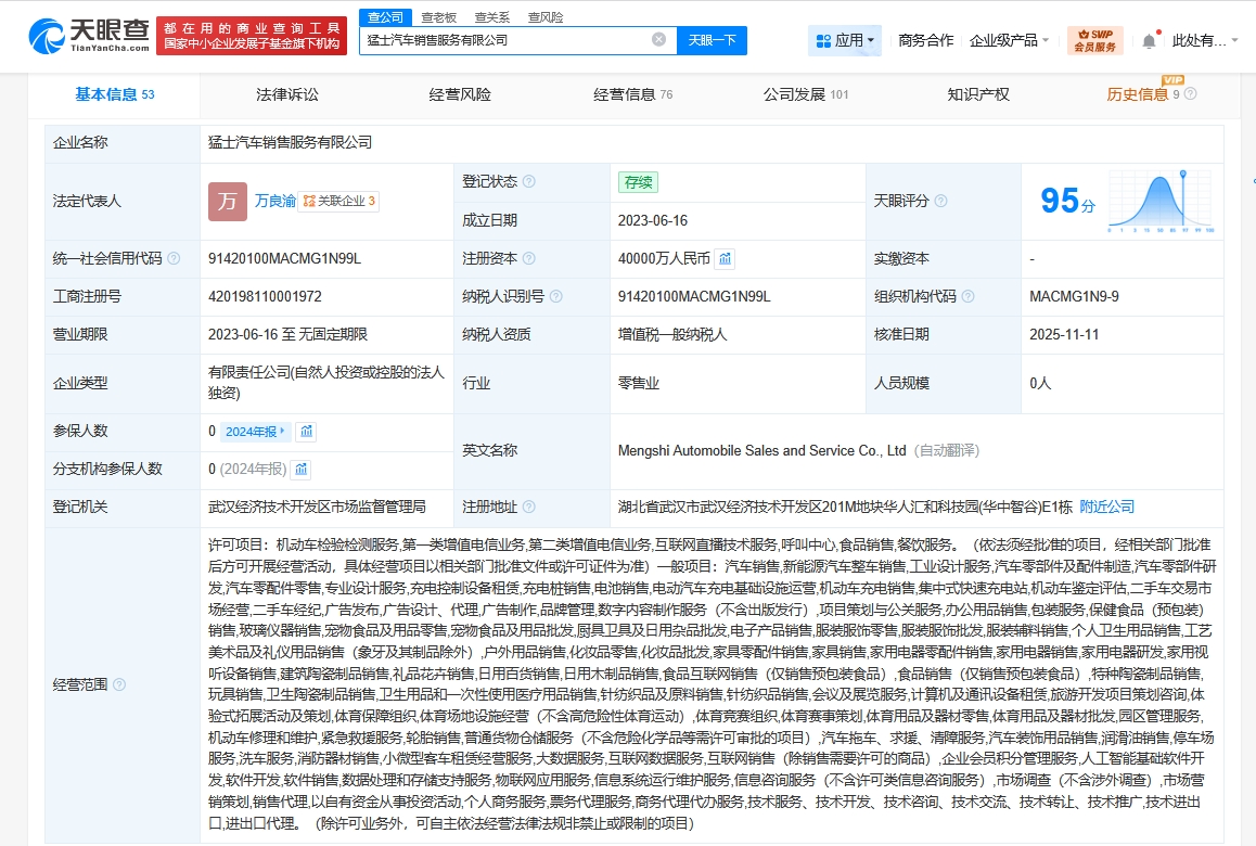 天眼查工商信息显示,近日,猛士汽车销售服务有限公司发生工商变更,注册资本由1亿人民币增至4亿人民币,增幅300%,曹东杰卸任法定代表人、执行董事,由万良渝接任法定代表人并担任董事,同时,多位高管均发生变更。