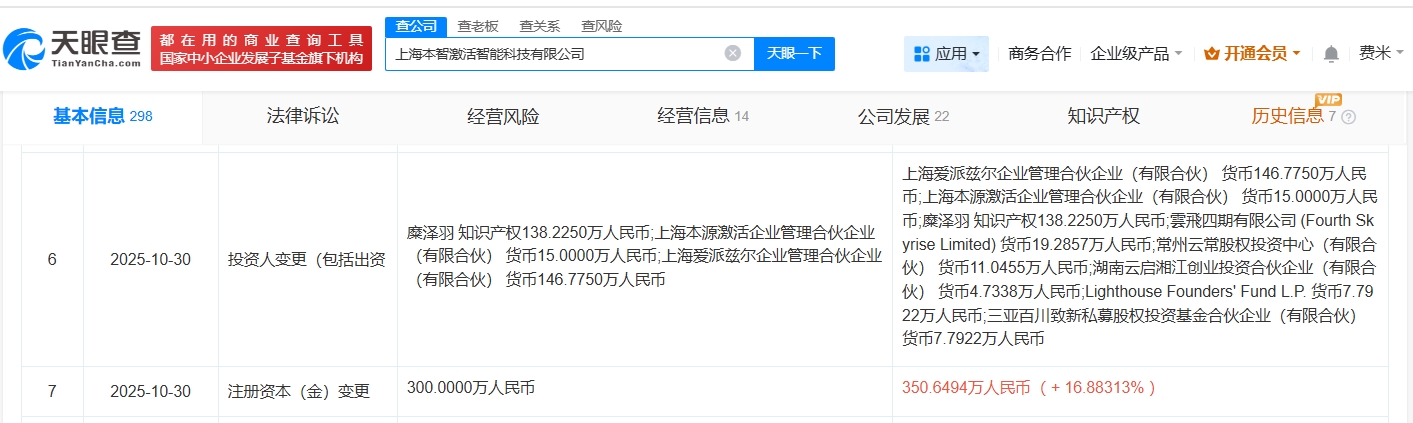 上海本智激活智能科技有限公司成立于今年1月,法定代表人为糜泽羽,经营范围包括人工智能基础软件开发、人工智能基础资源与技术平台、人工智能应用软件开发等。股东信息显示,该公司现由上海爱派兹尔企业管理合伙企业(有限合伙)、糜泽羽及上述新增股东等共同持股。公开资料显示,该公司是一家专注于端侧原生ai技术研发与应用的企业。