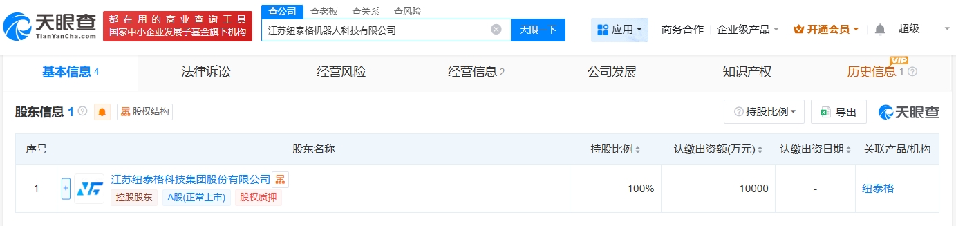 天眼查app显示,近日,江苏纽泰格机器人科技有限公司成立,法定代表人为张义,注册资本1亿人民币,经营范围包括软件开发、软件销售、智能机器人的研发、工业机器人制造等。股东信息显示,该公司由纽泰格(301229)全资持股。