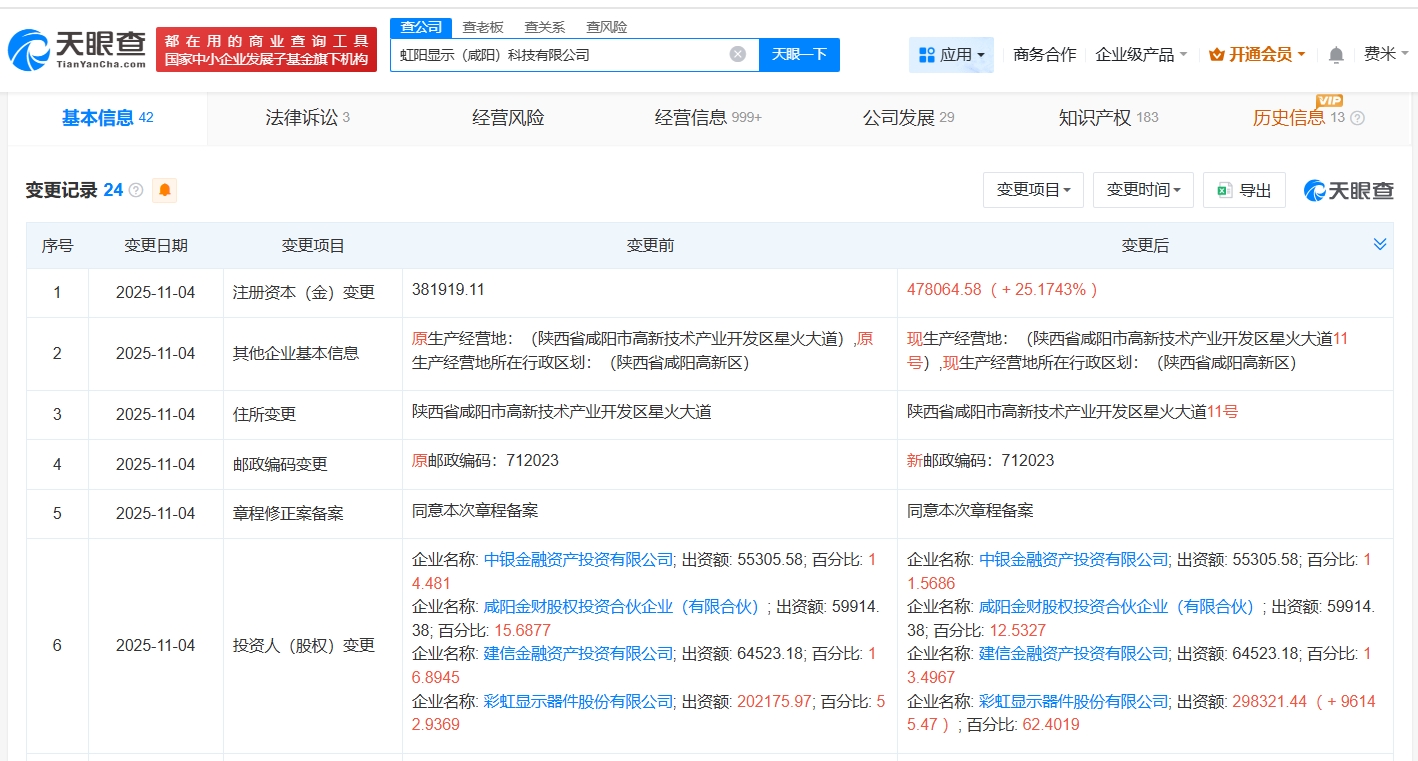 天眼查工商信息显示,近日,虹阳显示(咸阳)科技有限公司发生工商变更,注册资本由约38.2亿人民币增至约47.8亿人民币,增幅约25%。