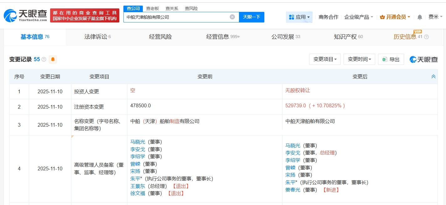 天眼查app显示,近日,中船(天津)船舶制造有限公司发生工商变更,企业名称变更为中船天津船舶有限公司,注册资本由47.85亿人民币增至约53亿人民币,增幅约11%。同时,部分主要人员发生变更。