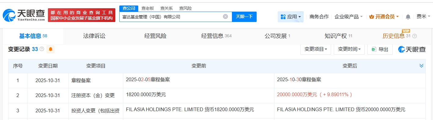 天眼查app显示,近日,富达基金管理(中国)有限公司发生工商变更,注册资本由1.82亿美元增至2亿美元,增幅约10%。