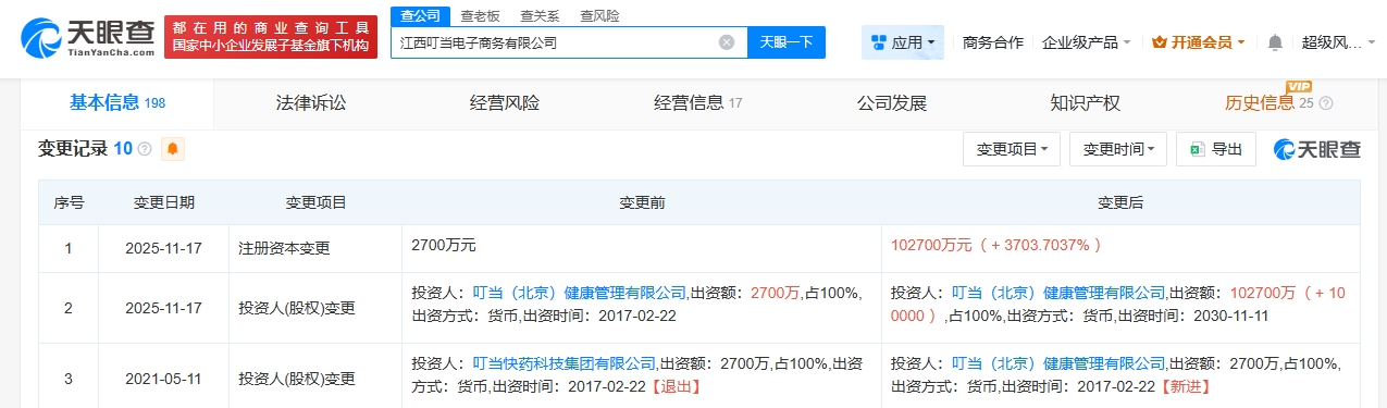 天眼查app显示,近日,江西叮当电子商务有限公司发生工商变更,注册资本由2700万人民币增至10.27亿人民币,增幅约3708%。