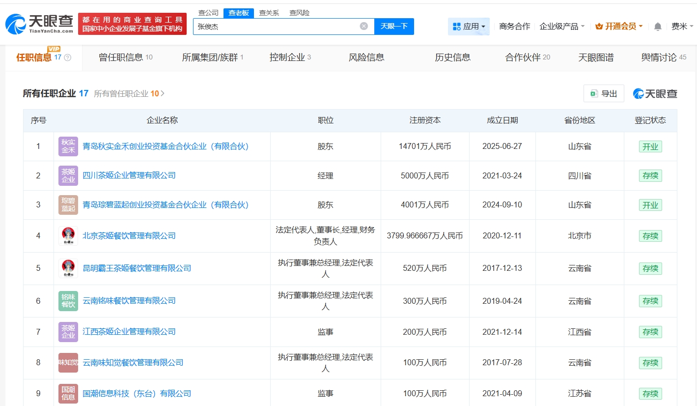 天眼查任职信息显示,霸王茶姬创始人张俊杰名下关联17家企业,其中9家处于存续状态,包括青岛秋实金禾创业投资基金合伙企业(有限合伙)、北京茶姬餐饮管理有限公司、昆明霸王茶姬餐饮管理有限公司等,张俊杰在上述公司担任法定代表人、执行董事等职务。天合光能董事长高海纯名下关联29家企业,包括天合光能股份有限公司、天合富家能源股份有限公司、江苏天合储能有限公司等。查关系信息显示,张俊杰与高海纯无商业关联。