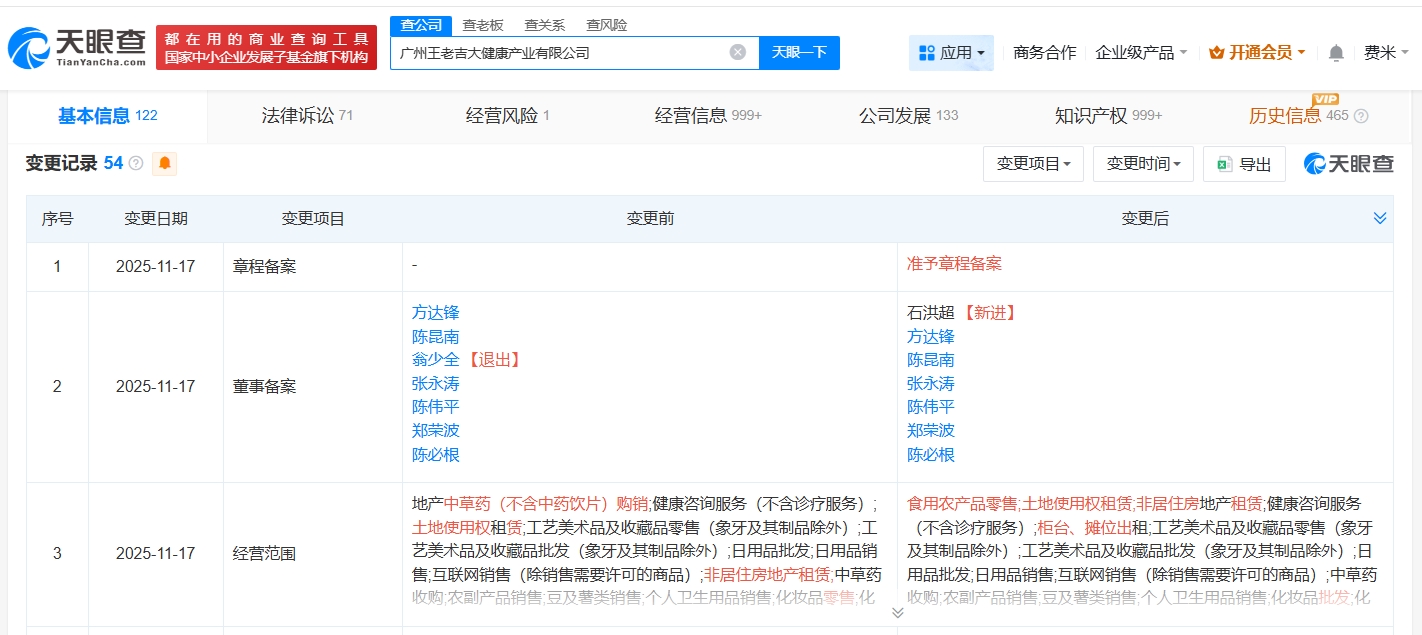 天眼查工商信息显示,近日,王老吉关联公司广州王老吉大健康产业有限公司发生工商变更,注册资本由9亿人民币增至10亿人民币,增幅约11%,同时发生高管变更。