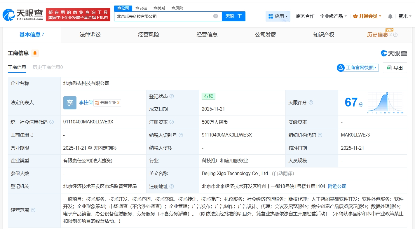 天眼查工商信息显示,近日,北京悉去科技有限公司成立,法定代表人为李柱保,注册资本500万人民币,经营范围包括社会经济咨询服务、凯发娱发k8的版权代理、人工智能基础软件开发等。股权全景穿透图显示,该公司由京东科技旗下北京汇钧科技有限公司全资持股。