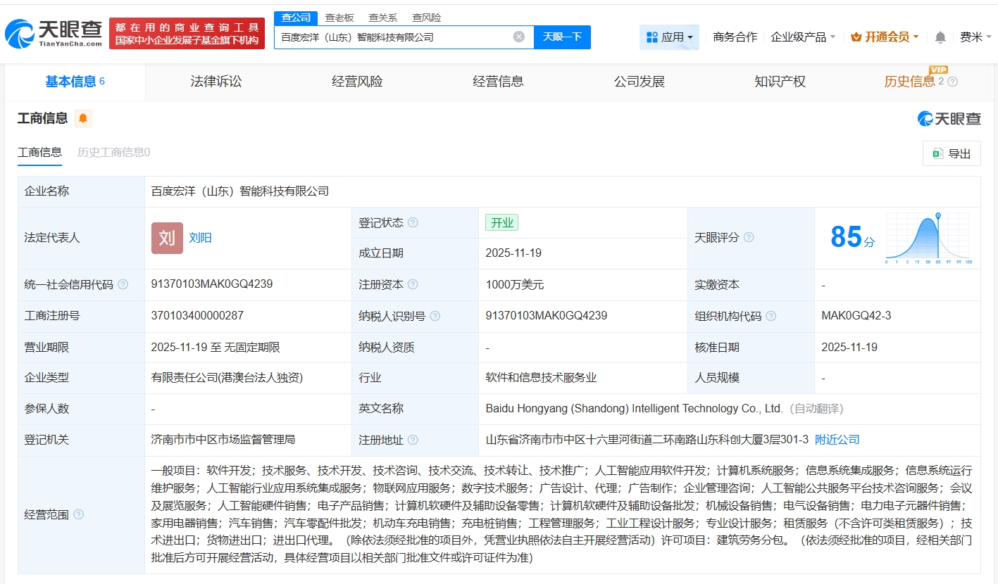 天眼查工商信息显示,近日,百度宏洋(山东)智能科技有限公司成立,法定代表人为刘阳,注册资本1000万美元,经营范围包括人工智能应用软件开发、人工智能行业应用系统集成服务、物联网应用服务等。股东信息显示,该公司由百度(香港)有限公司全资持股。