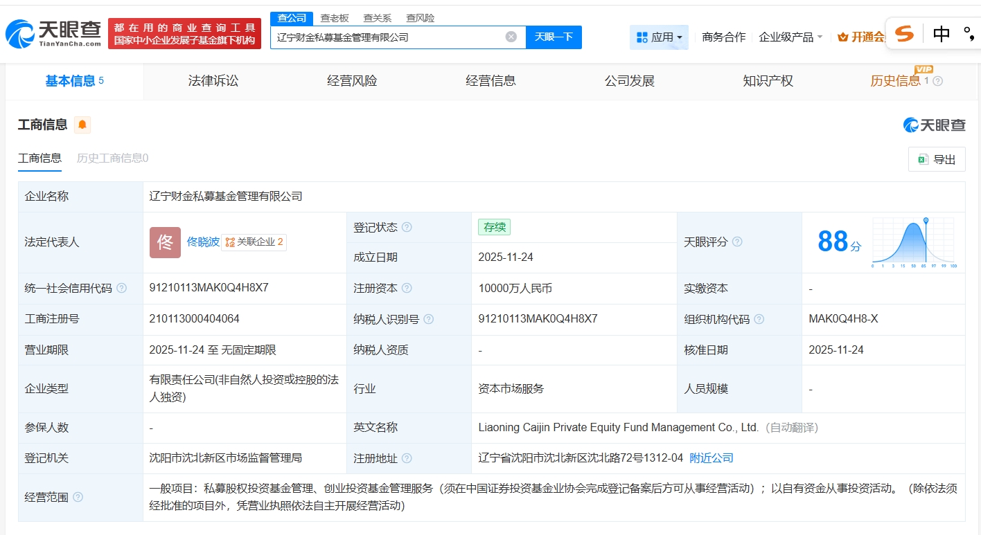 天眼查工商信息显示,近日,辽宁财金私募基金管理有限公司成立,法定代表人为佟晓波,注册资本1亿人民币,经营范围为私募股权投资基金管理、创业投资基金管理服务、以自有资金从事投资活动。股东信息显示,该公司由辽宁基金投资有限公司全资持股。