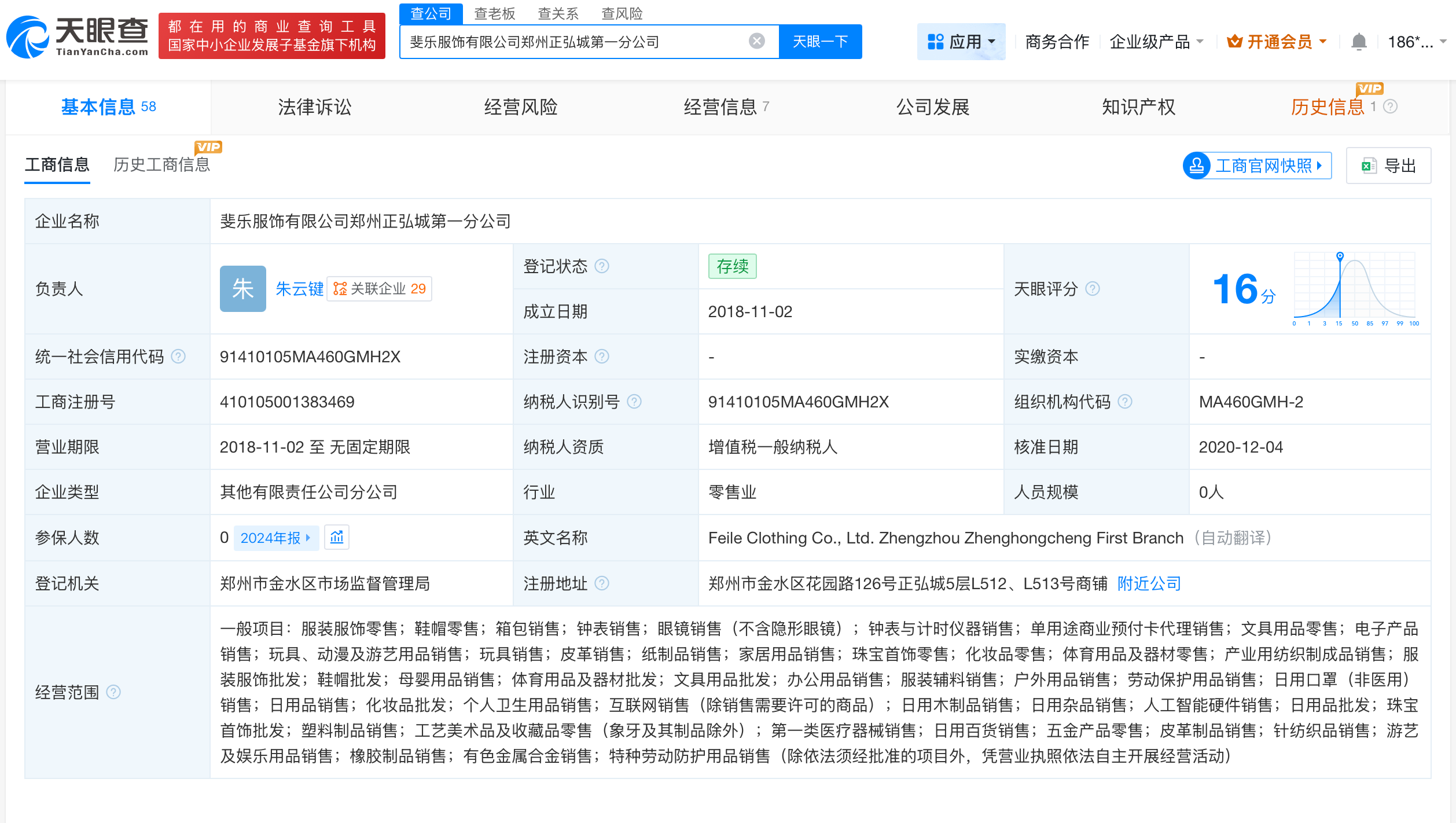 天眼查app显示,斐乐服饰有限公司郑州正弘城第一分公司成立于2018年11月,负责人为朱云键,经营范围包括服装服饰零售、鞋帽零售等,其总公司为斐乐服饰有限公司。年报信息显示,该公司2020年至2024年参保人数均为0。