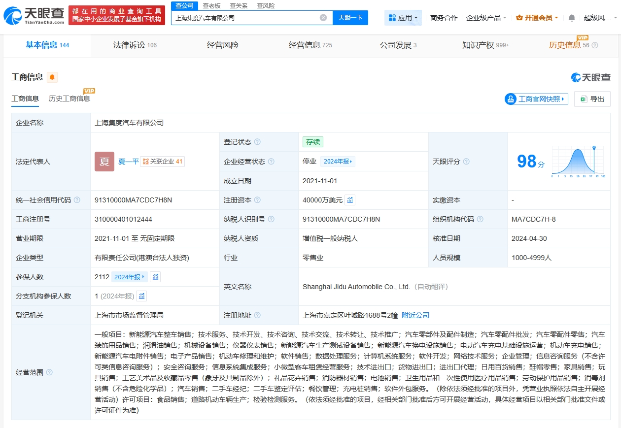 该公司成立于2021年11月,法定代表人为夏一平,注册资本4亿美元,经营范围包括新能源汽车整车销售、汽车零部件及配件制造、汽车零配件批发、电动汽车充电基础设施运营等。股东信息显示,该公司由集度汽车(香港)有限公司全资持股。据媒体报道,去年12月,极越汽车陷入资金链断裂、供应商公开追讨欠款等事件,引发多方关注。