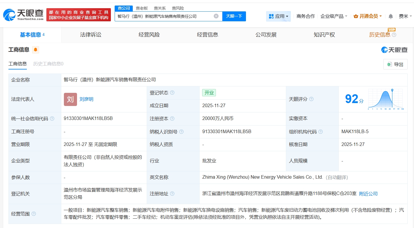 天眼查app显示,11月27日,智马行(温州)新能源汽车销售有限责任公司成立,法定代表人为刘彦明,注册资本2亿人民币,经营范围包括新能源汽车整车销售、新能源汽车电附件销售、新能源汽车换电设施销售、汽车销售等。股东信息显示,该公司由威马汽车制造温州有限公司全资持股。