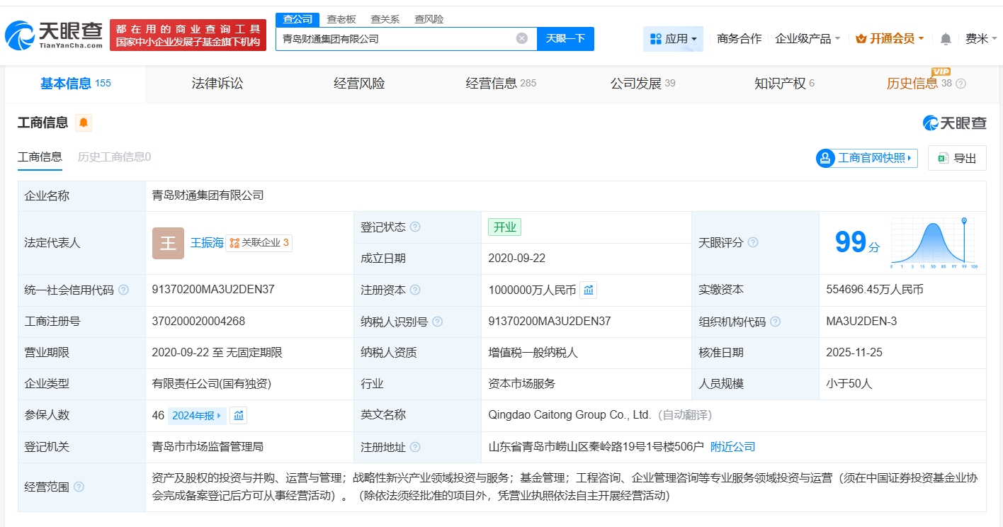 青岛财通集团有限公司成立于2020年9月,法定代表人王振海,经营范围包括资产及股权的投资与并购、运营与管理等。股东信息显示,该公司由青岛市财政局全资持股。