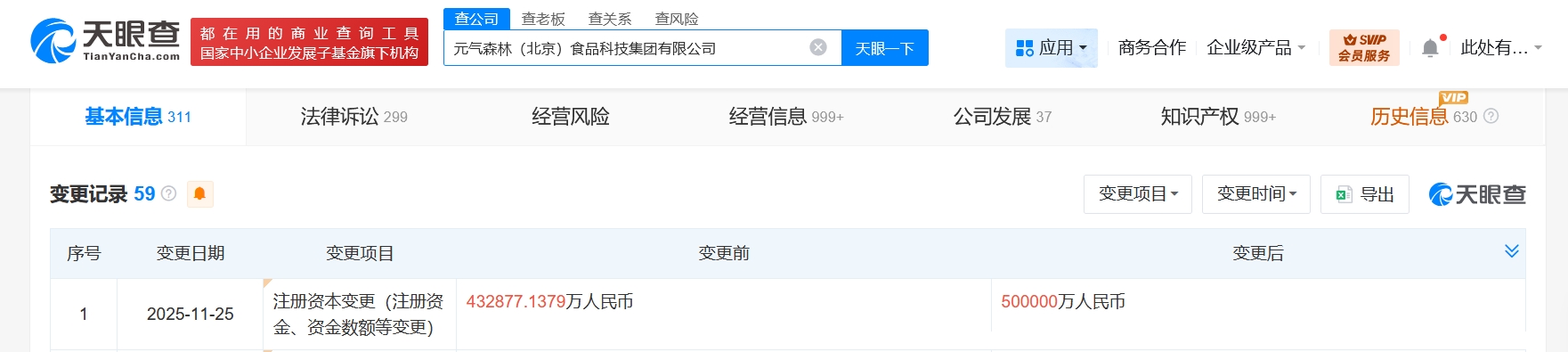 天眼查工商信息显示,近日,元气森林(北京)食品科技集团有限公司发生工商变更,注册资本由约43.3亿人民币增至50亿人民币,增幅约15.5%。