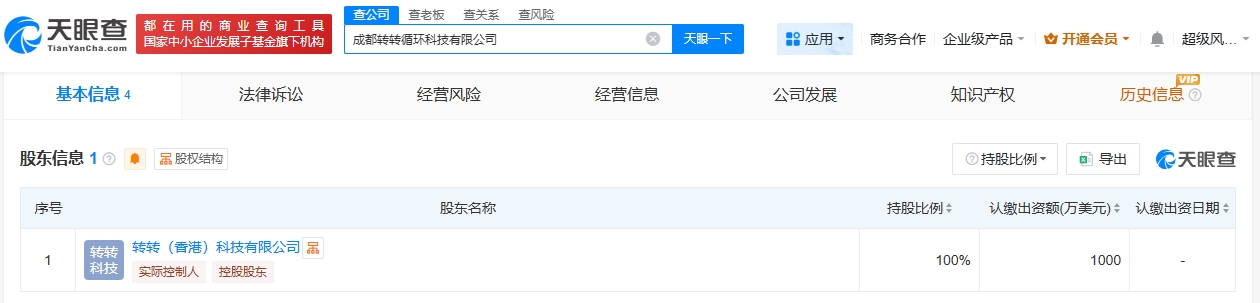 天眼查app显示,近日,成都转转循环科技有限公司成立,法定代表人为王溯,注册资本1000万美元,经营范围包括再生资源回收、再生资源销售、再生资源加工、固体废物治理等。股东信息显示,该公司由转转(香港)科技有限公司全资持股。