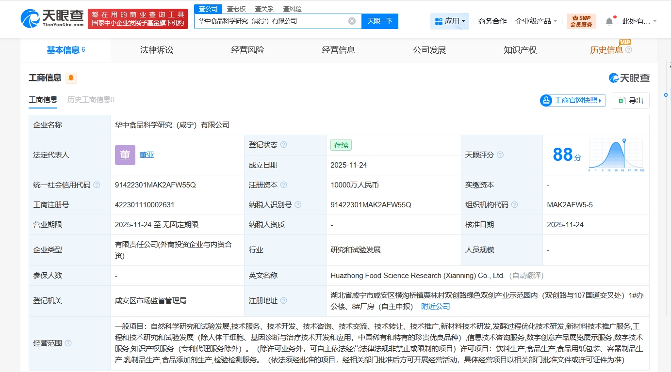 天眼查app显示,近日,华中食品科学研究(咸宁)有限公司成立,法定代表人为董亚,注册资本1亿人民币,经营范围含自然科学研究和试验发展、新材料技术研发、发酵过程优化技术研发、新材料技术推广服务、工程和技术研究和试验发展、饮料生产、食品生产等,由咸宁高新产业发展有限公司、元气森林(北京)食品科技集团有限公司分别持股90%、10%。