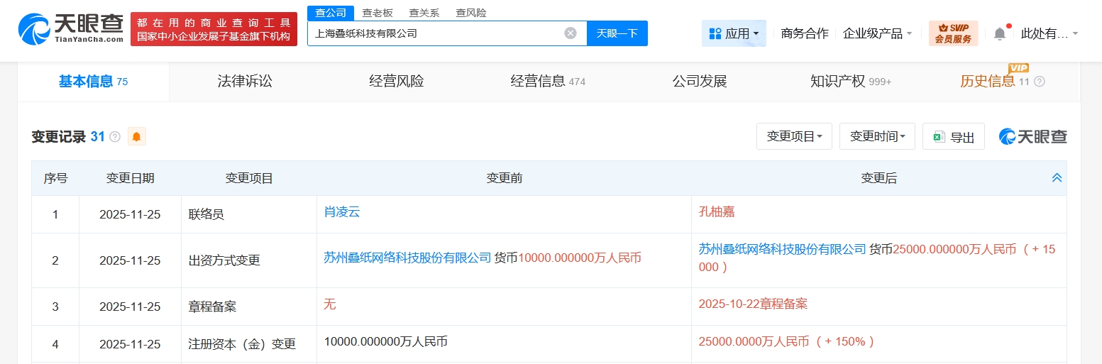 天眼查工商信息显示,近日,上海叠纸科技有限公司发生工商变更,注册资本由1亿人民币增至2.5亿人民币,增幅150%。值得一提的是,今年10月,姚润昊卸任该公司法定代表人、执行董事,由姚飞接任法定代表人并担任董事。