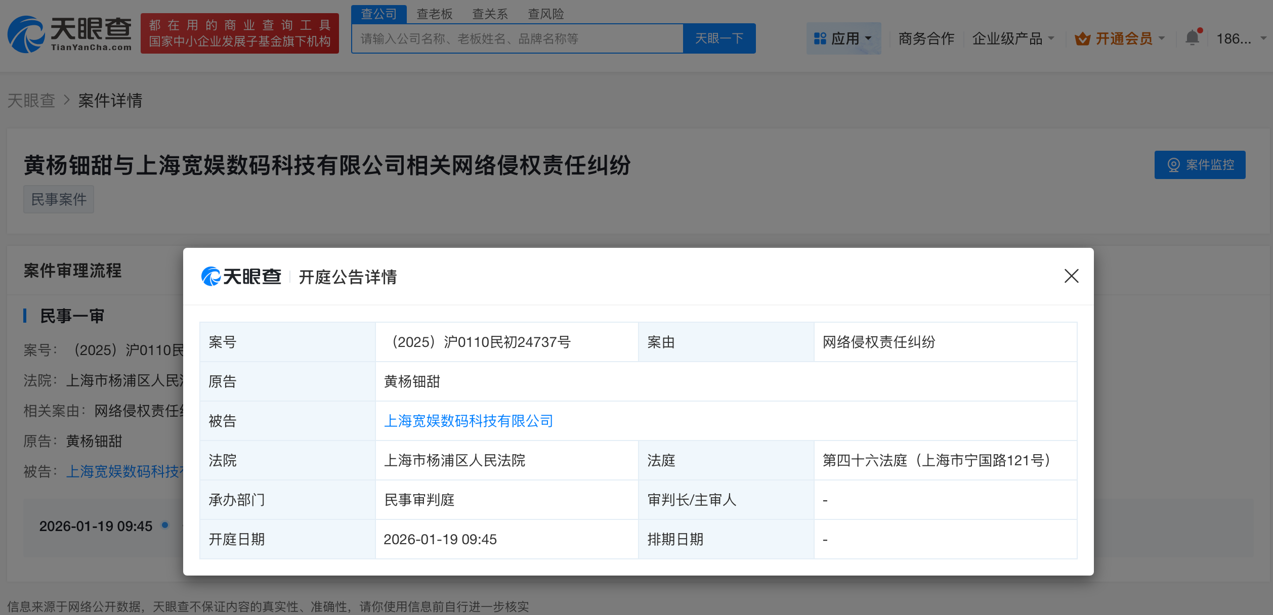 天眼查天眼风险信息显示,近日,黄杨钿甜与b站关联上海宽娱数码科技有限公司相关网络侵权责任纠纷案件新增开庭公告,原告为黄杨钿甜,该案将于2026年1月19日在上海市杨浦区人民法院开庭审理。