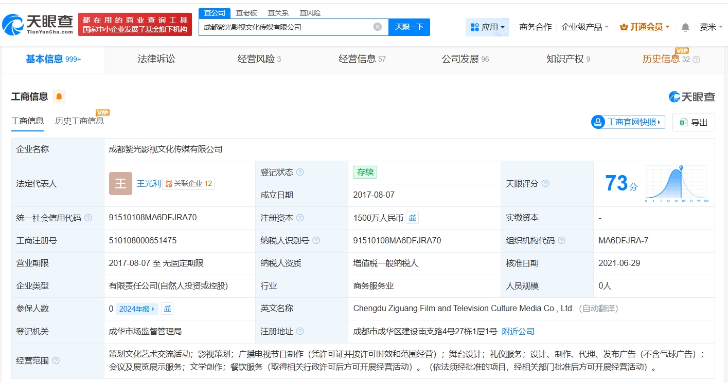 天眼查app显示,近日,成都紫光影视文化传媒有限公司登记状态由存续变更为注销,此前,该公司已发布注销备案公告。