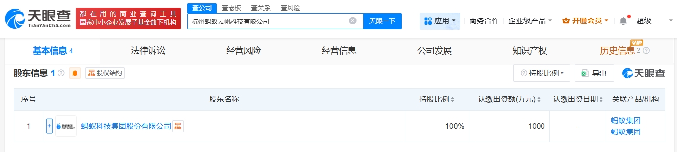 天眼查app显示,近日,杭州蚂蚁云帆科技有限公司成立,法定代表人为徐晟薇,注册资本1000万人民币,经营范围包括企业管理咨询、网络技术服务、计算机软硬件及辅助设备批发、互联网销售等。股东信息显示,该公司由蚂蚁科技集团股份有限公司全资持股。