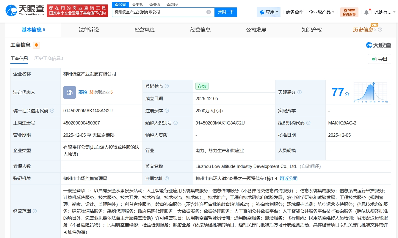 天眼查app显示,近日,柳州低空产业发展有限公司成立,法定代表人为邵铭,注册资本2000万人民币,经营范围含以自有资金从事投资活动、人工智能行业应用系统集成服务、信息咨询服务、信息系统集成服务、信息系统运行维护服务、计算机系统服务、工程和技术研究和试验发展、农业科学研究和试验发展、工程技术服务等。股东信息显示,该公司由广西柳州市轨道交通投资发展集团有限公司全资持股。