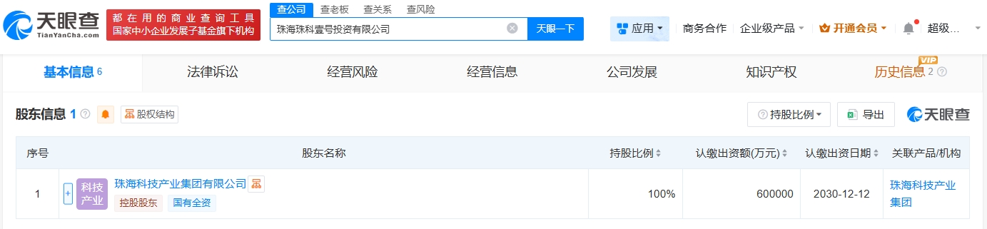天眼查app显示,近日,珠海珠科壹号投资有限公司成立,法定代表人为蔡如超,注册资本60亿人民币,经营范围包括以自有资金从事投资活动、企业管理咨询、财务咨询。股东信息显示,该公司由珠海科技产业集团有限公司全资持股。