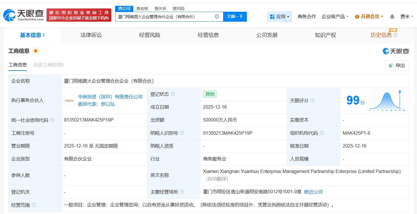 天眼查app显示,12月16日,厦门翔南圆火企业管理合伙企业(有限合伙)成立,执行事务合伙人为中保投资(深圳)有限责任公司,出资额50亿人民币,经营范围为企业管理、企业管理咨询、以自有资金从事投资活动,由中国保险投资基金(有限合伙)、中保投资(深圳)有限责任公司共同出资。