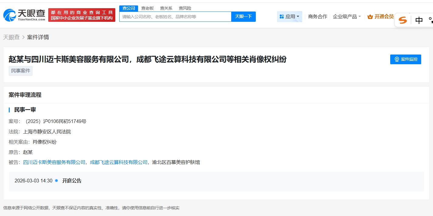 天眼查app显示,近日,赵丽颖与四川迈卡斯美容服务有限公司、成都飞途云算科技有限公司、渝北区百慕美容护肤馆相关肖像权纠纷案件新增一则开庭公告,原告为赵丽颖,该案将于2026年3月3日在上海市静安区人民法院开庭审理。