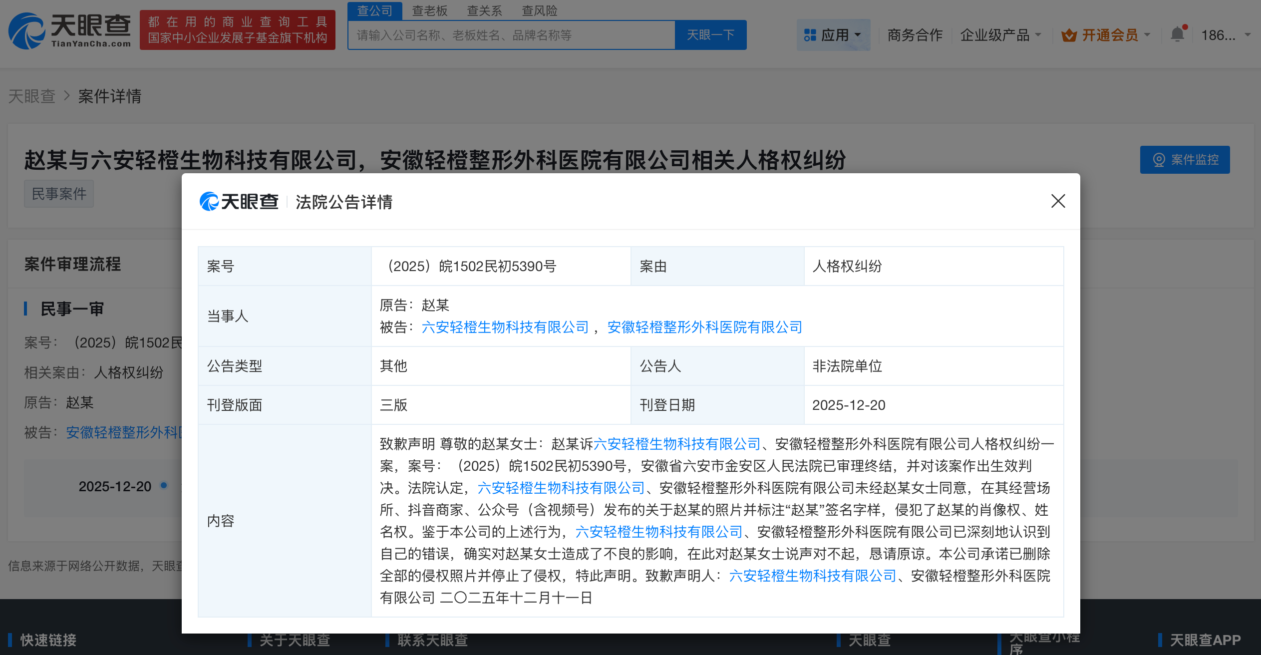 天眼查法律诉讼信息显示,近日,法院公开六安轻橙生物科技有限公司、安徽轻橙整形外科医院有限公司向赵丽颖的致歉声明。内容显示,六安轻橙生物科技有限公司、安徽轻橙整形外科医院有限公司未经赵丽颖女士同意,在其经营场所、抖音商家、公众号(含视频号)发布的关于赵丽颖的照片并标注“赵丽颖”签名字样,侵犯了赵丽颖的肖像权、姓名权。鉴于本公司的上述行为,六安轻橙生物科技有限公司、安徽轻橙整形外科医院有限公司已深刻地认识到自己的错误,确实对赵丽颖女士造成了不良的影响,在此对赵丽颖女士说声对不起,恳请原谅。