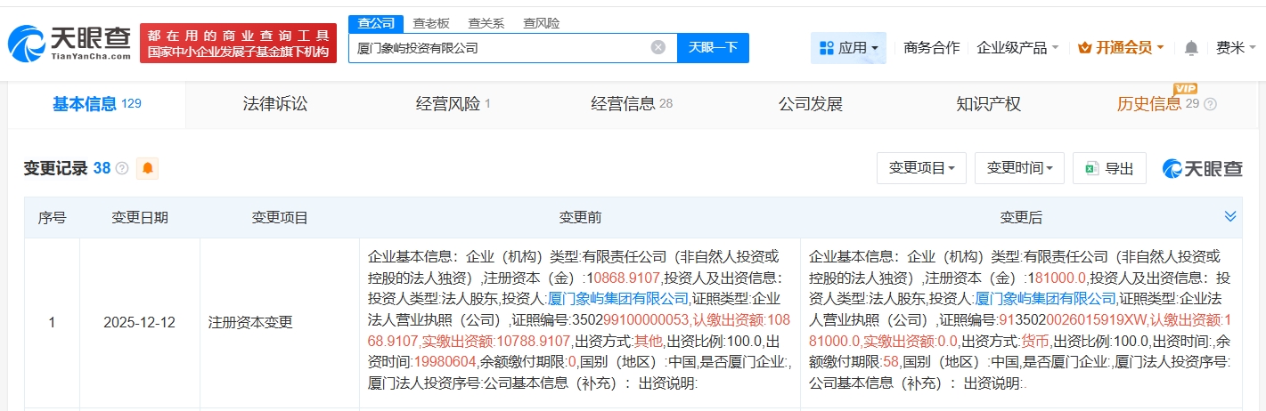 天眼查app显示,近日,厦门象屿投资有限公司发生工商变更,注册资本由约1.09亿人民币增至18.1亿人民币,增幅约1565%。