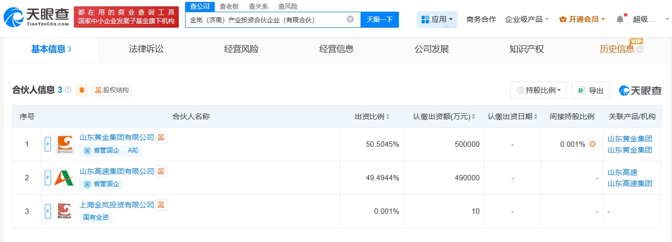 天眼查工商信息显示,近日,金岚(济南)产业投资合伙企业(有限合伙)成立,执行事务合伙人为上海金岚投资有限公司,出资额约99亿人民币,经营范围为以自有资金从事投资活动。合伙人信息显示,该合伙企业由山东黄金集团有限公司、山东高速集团有限公司、上海金岚投资有限公司共同出资。