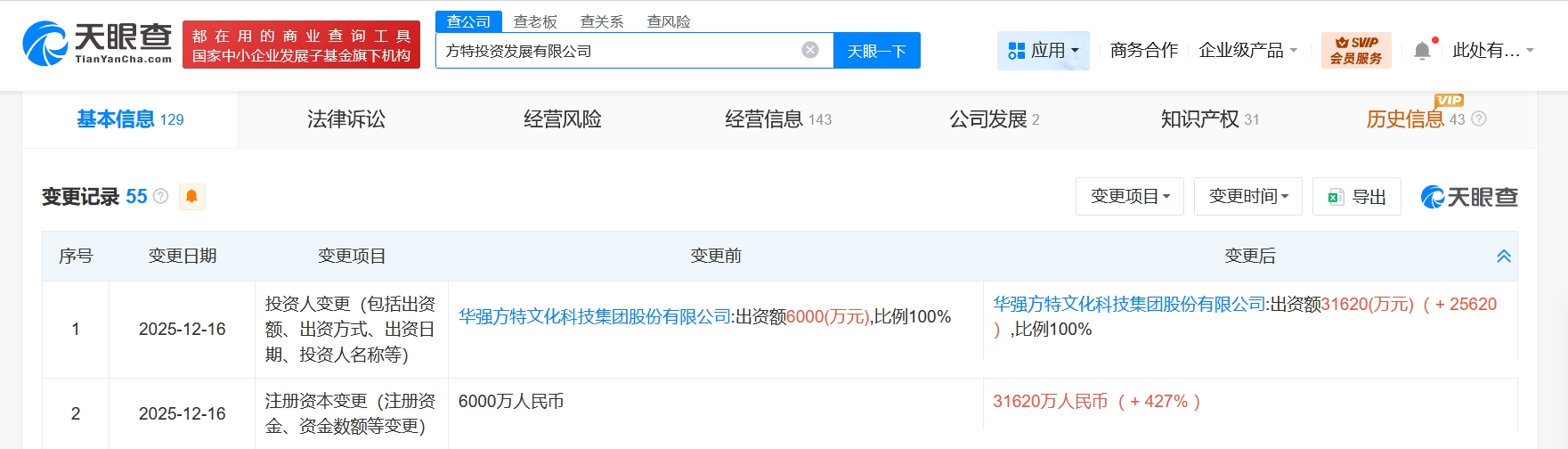 天眼查app显示,近日,方特投资发展有限公司发生工商变更,注册资本由6000万人民币增至约3.2亿人民币,增幅427%。