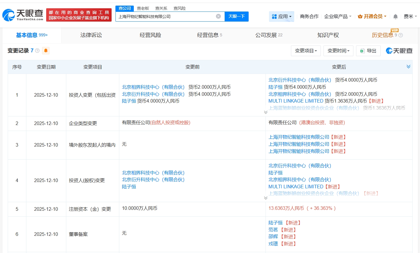 天眼查app显示,近日,上海开物纪智能科技有限公司发生工商变更,新增百度旗下三亚百川致新私募股权投资基金合伙企业(有限合伙)、上海蓝驰新皓创业投资合伙企业(有限合伙)等为股东,注册资本由10万人民币增至约13.6万人民币,同时,多位高管发生变更。