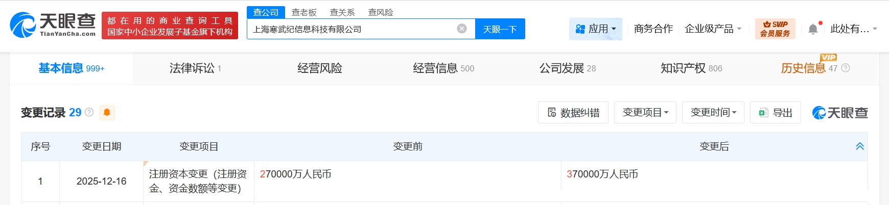 天眼查app显示,近日,上海寒武纪信息科技有限公司发生工商变更,注册资本由27亿人民币增至37亿人民币,增幅约37%。