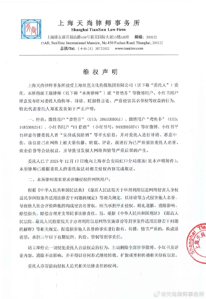 12月18日,@天尚律师事务所发文:本所接受上海丝芭文化传媒集团有限公司委托,发表维权声明。就“曾艳芬”等用户肆意发布针对委托人的侮辱、诽谤、贬损性言论,严重侵害其名誉权等权益的行为,委托人已于2025年12月17日晚向上海市公安局虹口分局报案,律师已根据委托人的委托依法对相关侵权内容完成取证。