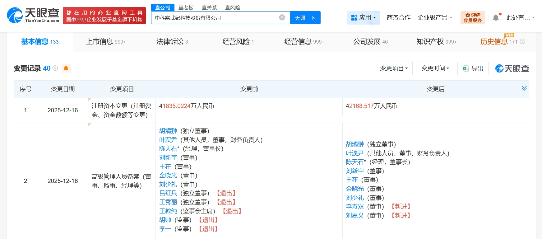 天眼查工商信息显示,近日,寒武纪(688256)发生工商变更,注册资本由约4.18亿人民币增至约4.22亿人民币,同时,部分高管也发生变更。
