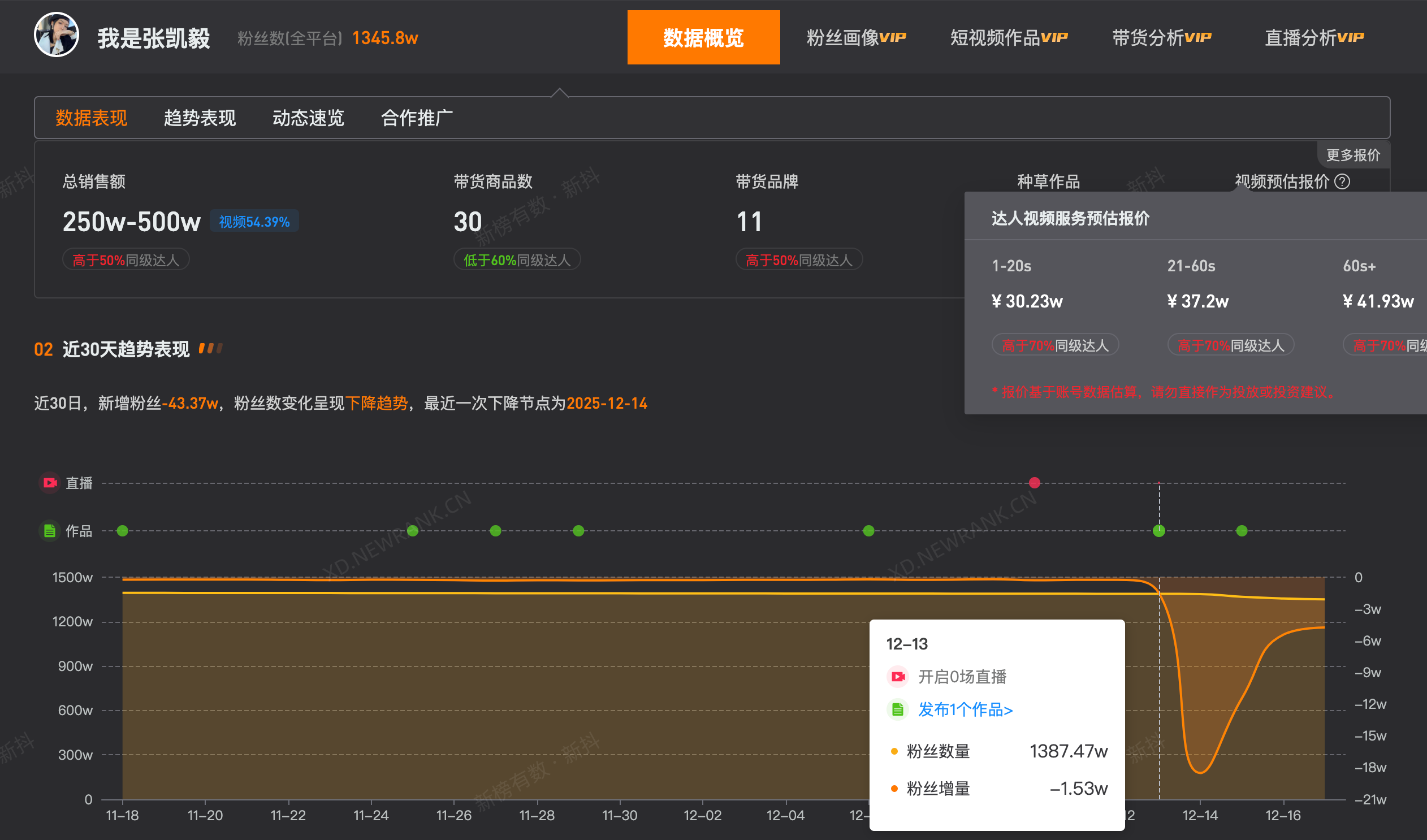 第三方数据显示,“我是张凯毅”视频平台12月13日粉丝数为1387.47万,截至18日上午11点,其粉丝数为1344.3万,掉粉超43万。商业化水平显示,其1-20s、21-60s、60s以上视频广告报价分别为30.23万、37.2万和41.93万。