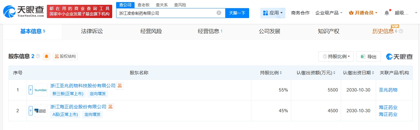 天眼查app显示,近日,浙江凌愈制药有限公司成立,法定代表人为张洪瑶,注册资本1亿人民币,经营范围包括药品生产、药品批发、技术进出口、货物进出口等。股东信息显示,该公司由浙江圣兆药物科技股份有限公司、海正药业(600267)共同持股。