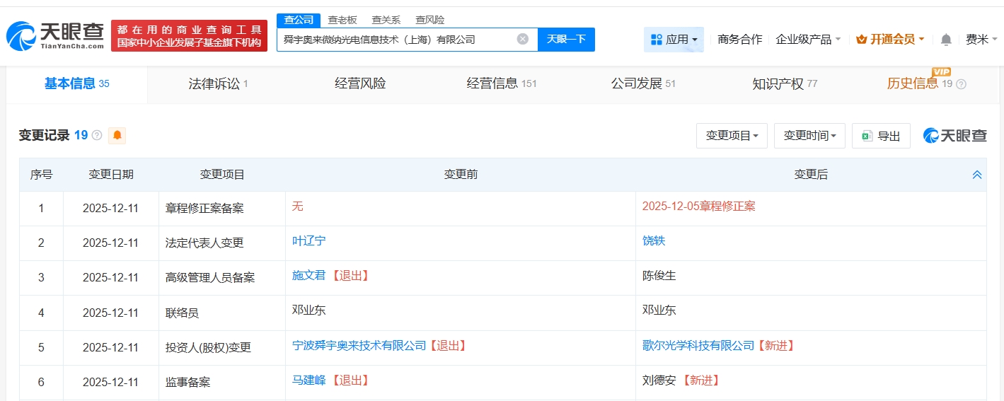 天眼查app显示,近日,舜宇奥来微纳光电信息技术(上海)有限公司发生工商变更,原股东舜宇光学旗下宁波舜宇奥来技术有限公司退出,新增歌尔光学科技有限公司为全资股东,同时,叶辽宁卸任该公司法定代表人,由饶轶接任。