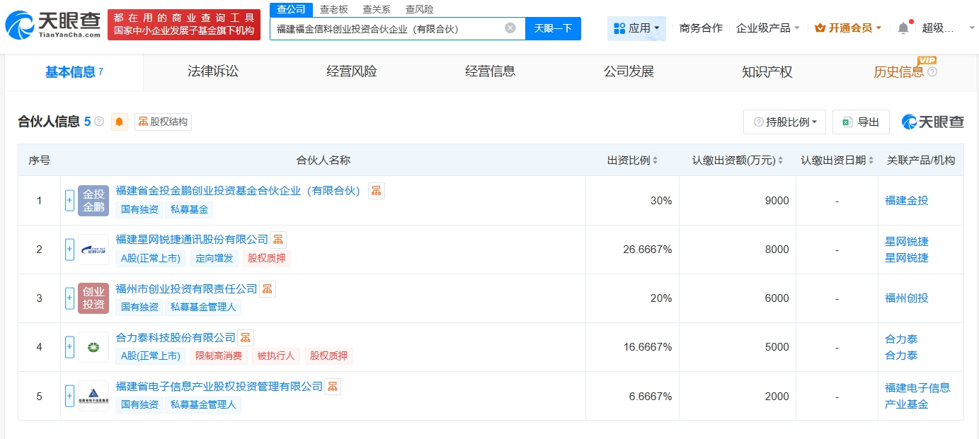 天眼查工商信息显示,近日,福建福金信科创业投资合伙企业(有限合伙)成立,执行事务合伙人为福建省电子信息产业股权投资管理有限公司,出资额3亿人民币,经营范围包括创业投资,以私募基金从事股权投资、投资管理、资产管理等活动。合伙人信息显示,该合伙企业由福建省金投金鹏创业投资基金合伙企业(有限合伙)、星网锐捷(002396)、合力泰(002217)等共同出资。