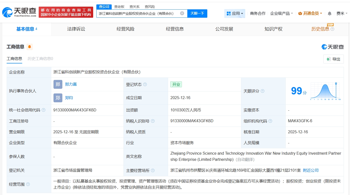 天眼查app显示,近日,浙江省科创战新产业股权投资合伙企业(有限合伙)成立,执行事务合伙人为那力嘉、郑钧,出资额101.03亿人民币,经营范围为以私募基金从事股权投资、投资管理、资产管理等活动,股权投资,创业投资,由农银资本管理有限公司、浙江省社保科创股权投资基金合伙企业(有限合伙)、杭州金创润泽管理咨询合伙企业(有限合伙)、浙江省创新产业私募基金管理有限公司共同出资。