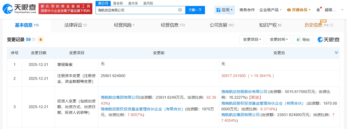 天眼查工商信息显示,近日,海航货运有限公司发生工商变更,新增海南航空控股股份有限公司为股东,注册资本由约2.59亿人民币增至约3.09亿人民币,增幅约19%。