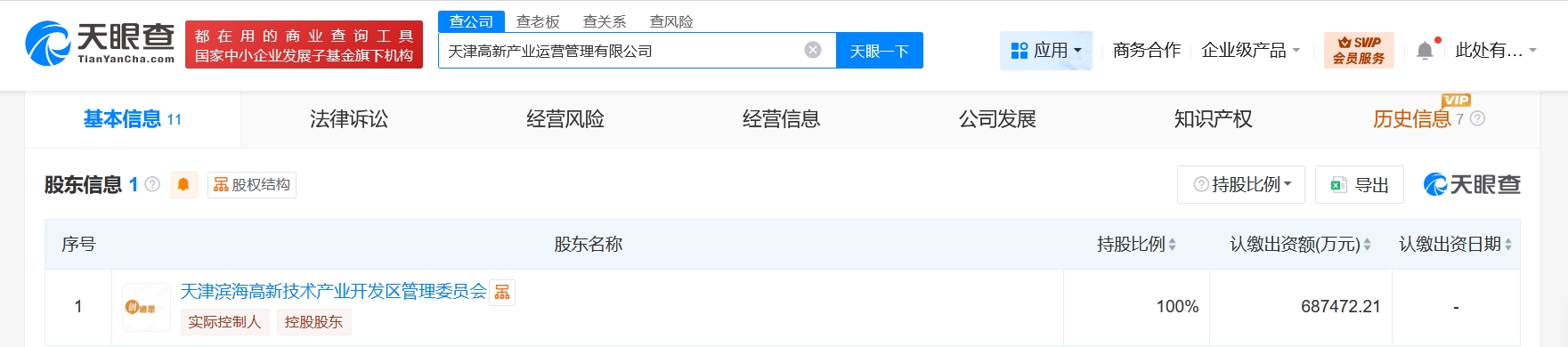 天眼查app显示,近日,天津高新产业运营管理有限公司成立,法定代表人为于浛,注册资本约68.7亿人民币,经营范围为商业综合体管理服务、住房租赁、非居住房地产租赁、机械设备租赁、停车场服务,由天津滨海高新技术产业开发区管理委员会全资持股。