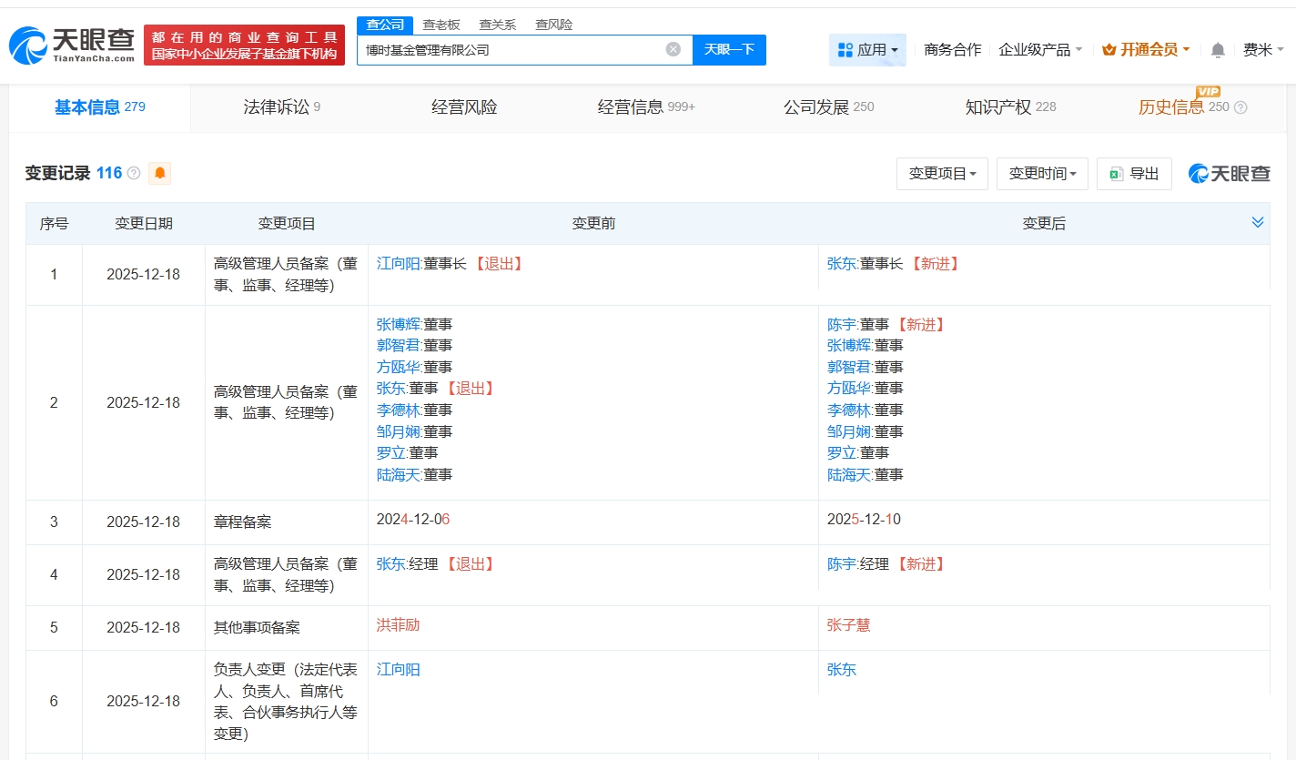 天眼查app显示,近日,博时基金管理有限公司发生工商变更,江向阳卸任董事长、法定代表人,由张东接任,同时,张东卸任董事、经理职务,由陈宇接任。