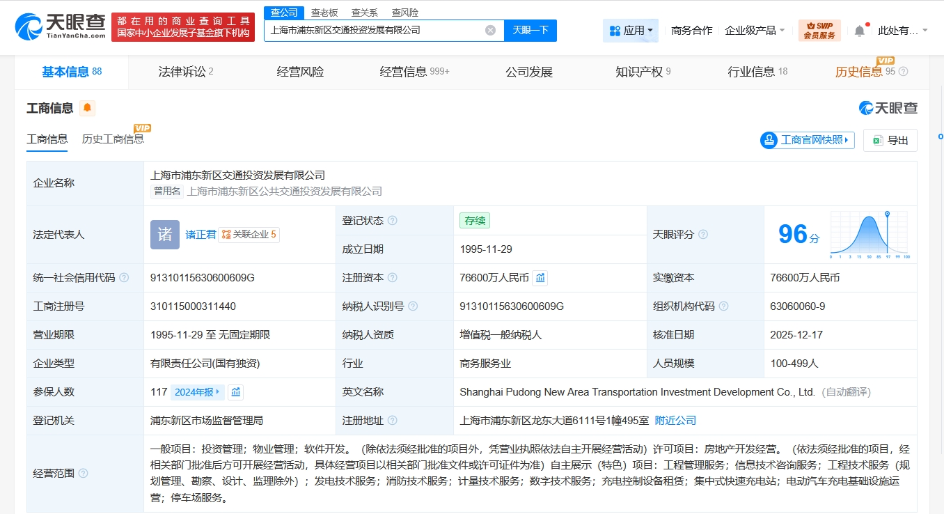 天眼查app显示,近日,上海市浦东新区交通投资发展有限公司发生工商变更,注册资本由5亿人民币增至7.66亿人民币,增幅约53%。