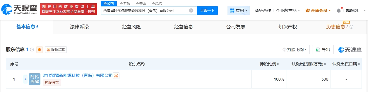 天眼查工商信息显示,近日,西海岸时代骐骥新能源科技(青岛)有限公司成立,法定代表人为李军亮,注册资本500万人民币,经营范围包括新兴能源技术研发、新能源汽车换电设施销售、在线能源计量技术研发、新能源汽车整车销售等。股东信息显示,该公司由宁德时代旗下时代骐骥新能源科技(青岛)有限公司全资持股。