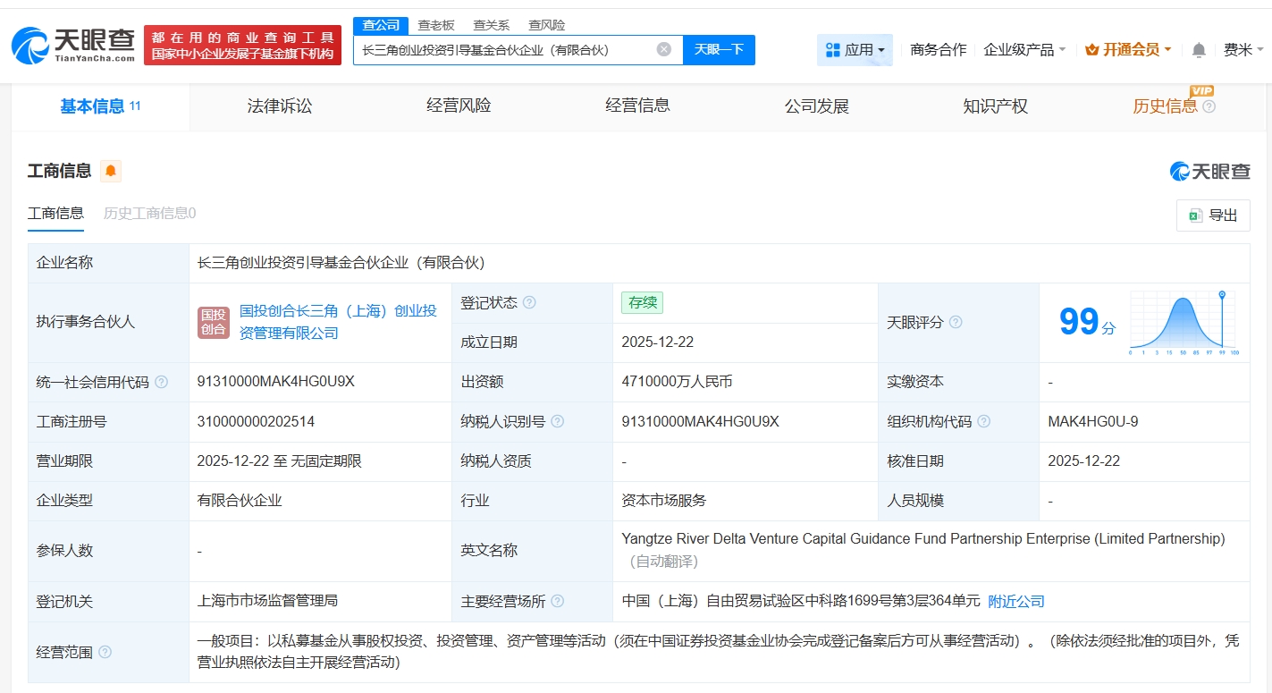 天眼查app显示,近日,长三角创业投资引导基金合伙企业(有限合伙)成立,执行事务合伙人为国投创合长三角(上海)创业投资管理有限公司,出资额471亿人民币,经营范围为以私募基金从事股权投资、投资管理、资产管理等活动,由安徽海螺集团有限责任公司、国家创业投资引导基金有限公司、国家开发投资集团有限公司等共同出资。