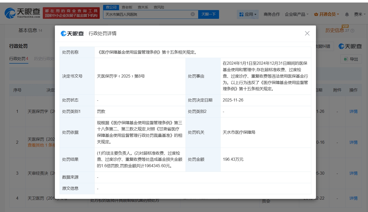 天眼查经营风险信息显示,近日,天水市第四人民医院因存在超标准收费、过度检查、过度诊疗、重复收费等违法使用医保基金行为,被天水市医疗保障局罚款196万余元。