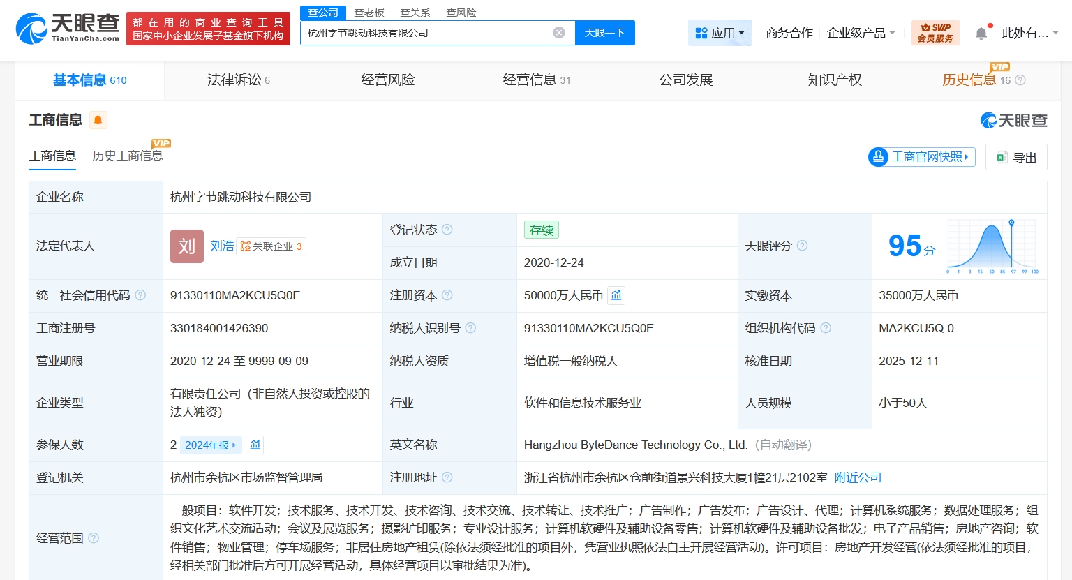 天眼查app显示,近日,杭州字节跳动科技有限公司发生工商变更,注册资本由4.7亿人民币增至5亿人民币,增幅约6%。